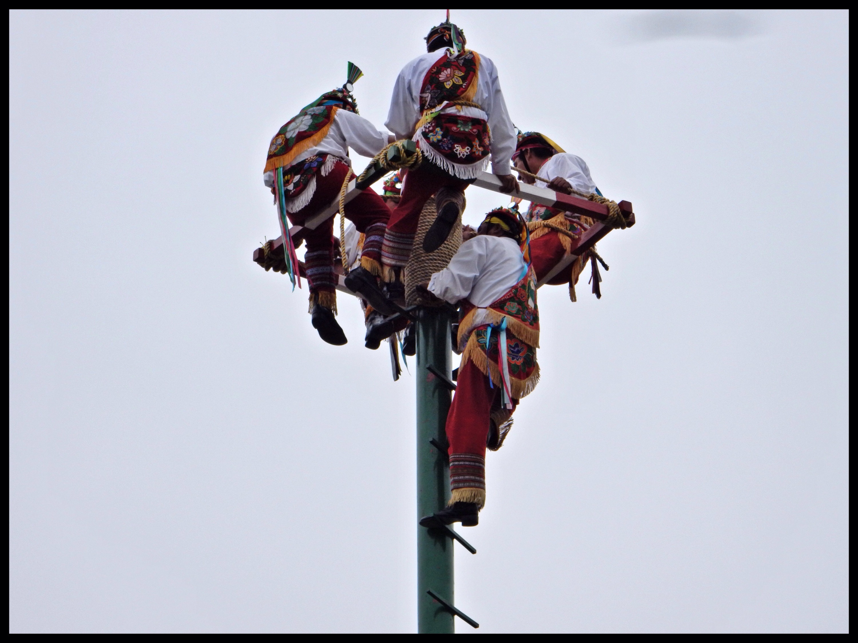 Doing the “Danza de los Voladores”. It’s an ancient ritual which was created, to end a drought. “At least 450 years ago there was a severe drought that brought hunger to the people. The gods were withholding the rain because the people had neglected them. The ceremony was created, to appease the gods and bring back the rains.” Five guys climb up a 30 metre pole and spin around for a while. One guy plays the flute while the other four descend to the ground by ropes.